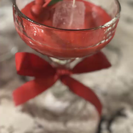 Handmade festive candle. Poured into an elegant glass, this red candle is designed to look like a seasonal cocktail, complete with a faux ice cube, holly leaves, and berries. Tied with a satin red ribbon, it’s the perfect blend of charm and cozy elegance—ideal for gifts, centerpieces, or adding a warm glow to your home or holiday décor.